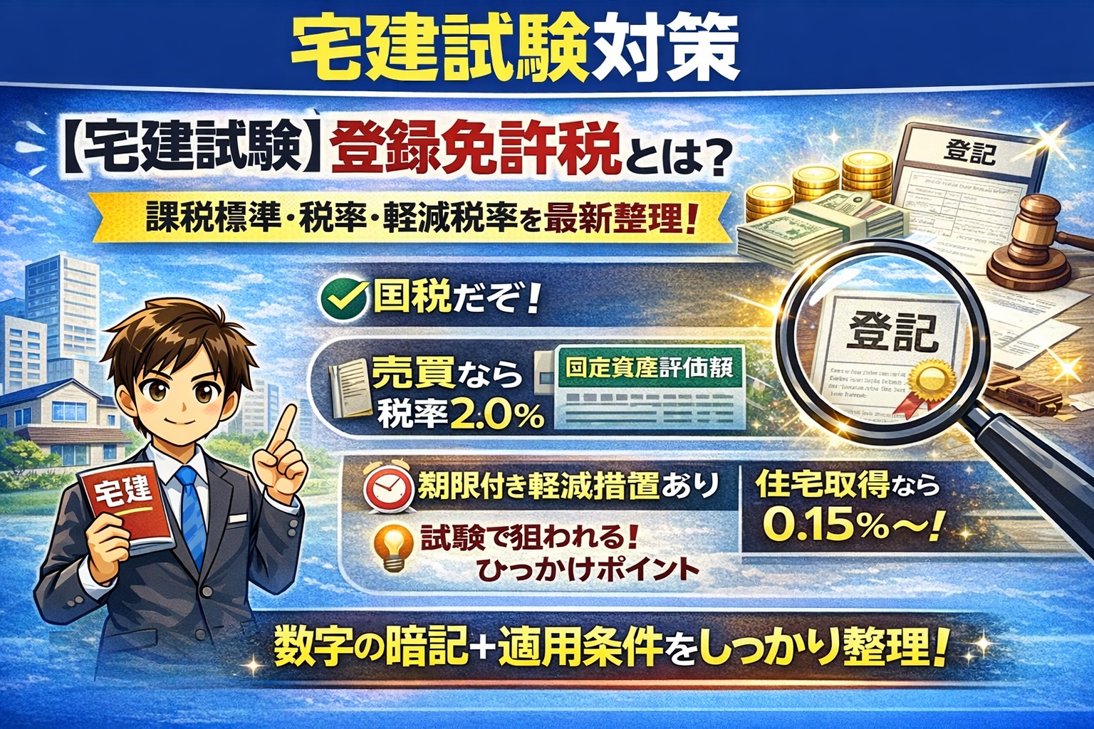 宅建試験では、登録免許税・不動産取得税・固定資産税といった税金分野から、毎年1問前後が安定して出題されます。